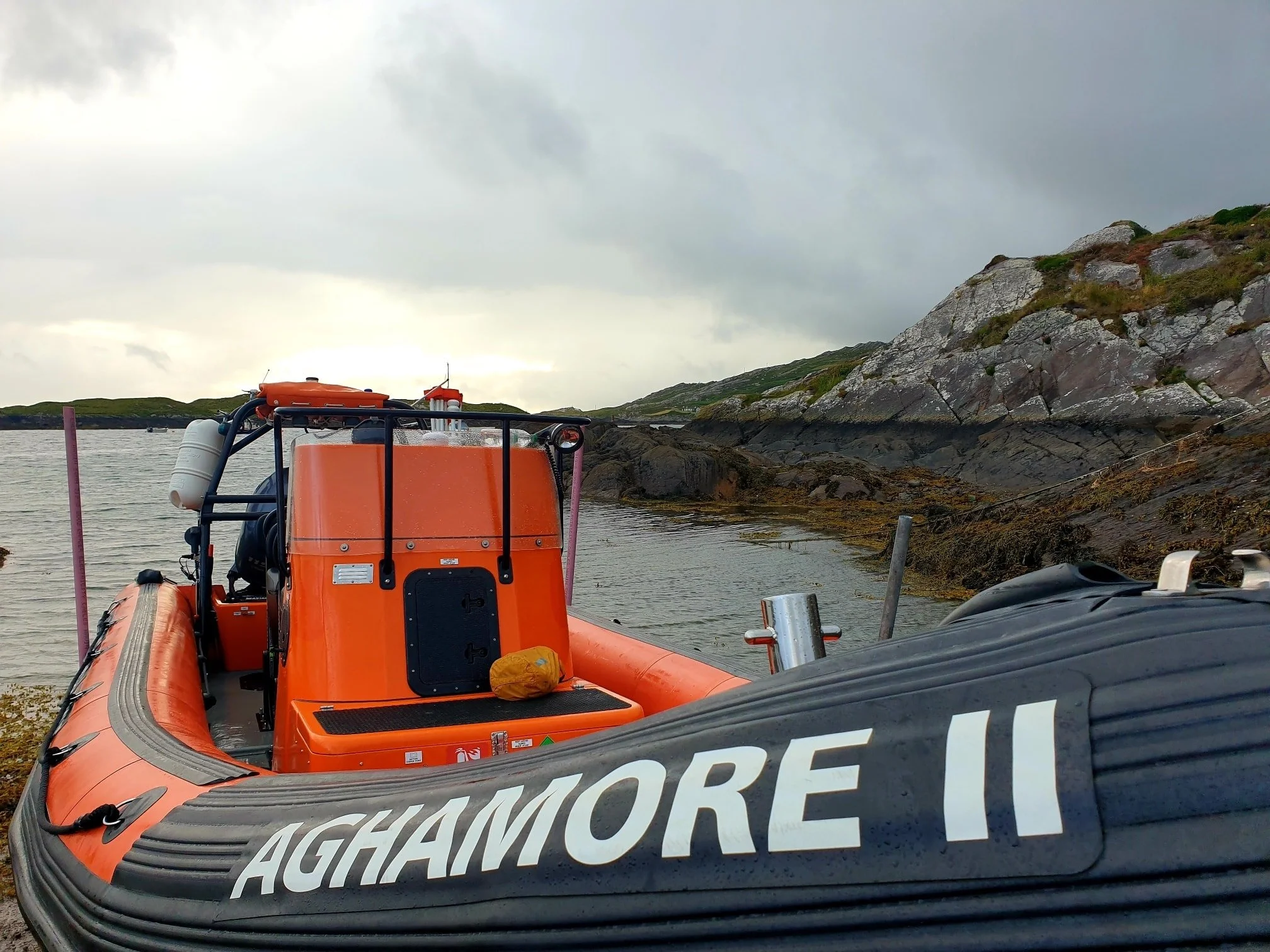 The lifeboat, “Aghamore II“, is manned, managed and crewed by local volunteers. Derrynane Inshore Rescue Service is 25 years old. It was founded by Austin (Ossie) Wilson, (who owned the water sports centre) in 1990 after a father and son drowned on Easter Monday – a misty day with strong swells. Inspite of being warned they they set out from Ballinskelligs to Derrynane but never arrived. The wife became worried but hesitated to call out the lifeboat from Valentia. By the time she raised the alarm and they were found they were dead – though not very long. Finding a body is always a deeply shocking experience – especially when you know it could have been avoided.